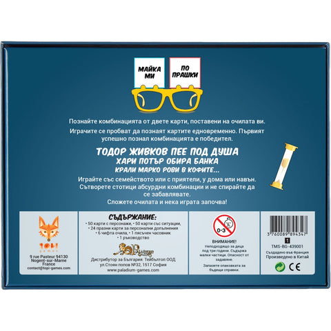 ШАНТАВИ И ЗАБАВНИ КОМБИНАЦИИ: Тази игра с карти предлага множество шантавикомбинации между личности и ситуации. Картите с „Личност“ се съчетават с картисъс „Ситуация“, за да създадат весели и напълно непредсказуеми моменти. С всякаигра можете да откриете нови комбинации, които ще ви разплачат от смях! Първиятиграч познал комбинацията от „Личност“ и „Ситуация“ на очилата си е победител.