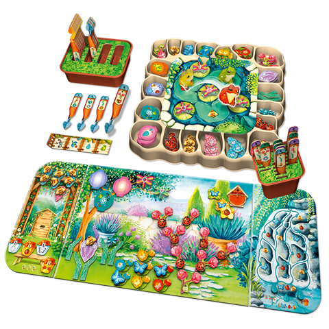 At the core of the game is the selection of gardening tools linked to specific action spaces on the action board; each tool allows players to take two elements from the supply. Although these elements can be arranged on the player’s garden board in any way, they must be placed according to certain rules to create sets and earn points at the end of the game. After placing the elements, the player performs the action corresponding to their selected tool, which can involve fluttering insects, moving a water drop, taking a leaf, or jumping their frog in the pond. The player’s turn ends with refilling the action board with a new tool and placing the used tool in their tool pot.