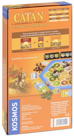 Градове и Рицари е разширение на базовата игра CATAN, което добавя по-сложна стратегия и развитие. Играчите изграждат градове, крепости и полиси. Целта е да съберете 13 точки за победа чрез строителство, търговия, градоустройство и тактично поставяне на вашите рицари, за да защитите успешно CATAN от варварите.